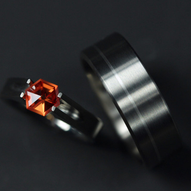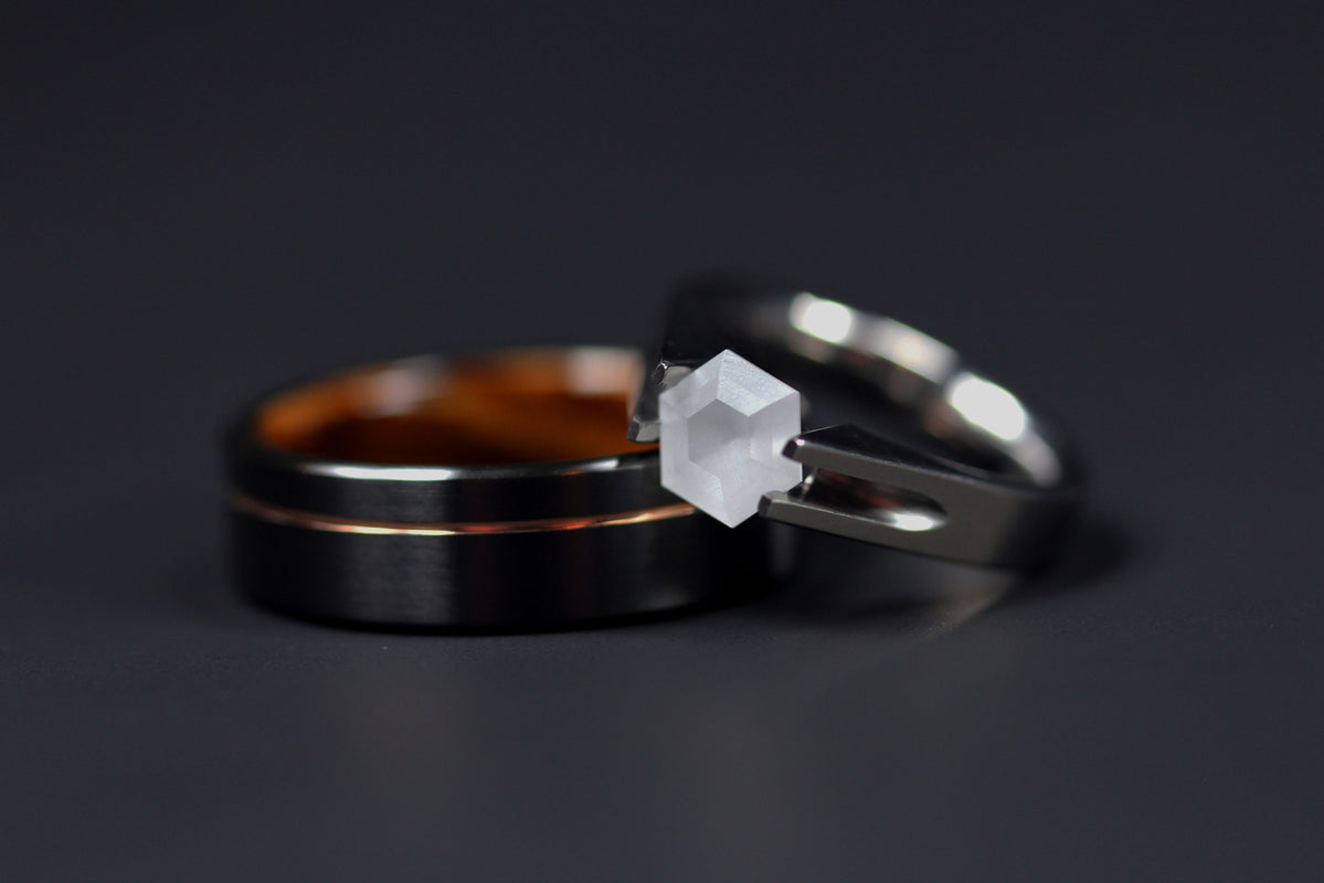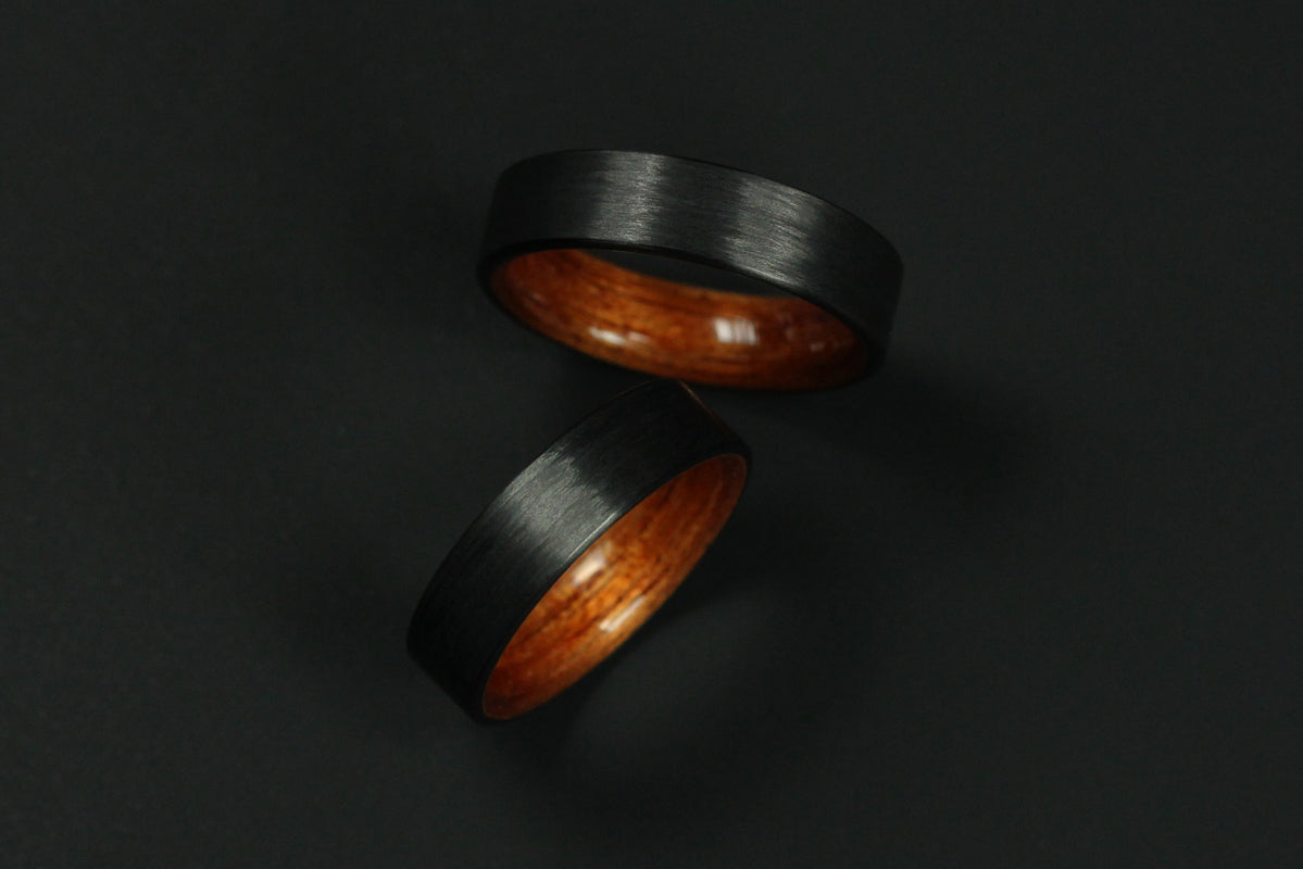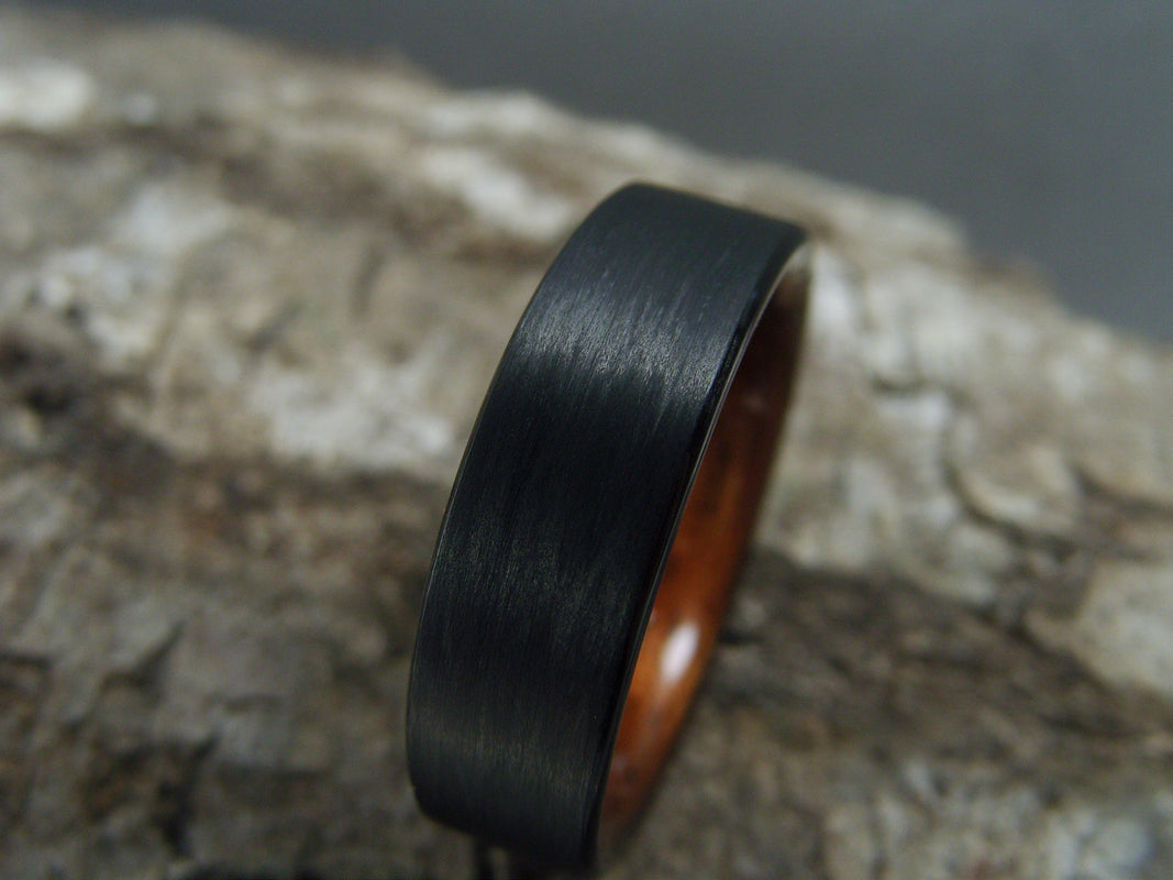 This special ring is our original wooden interior ring, with an outer shell of Titanium or Carbon Fiber, and an engraved interior plate.